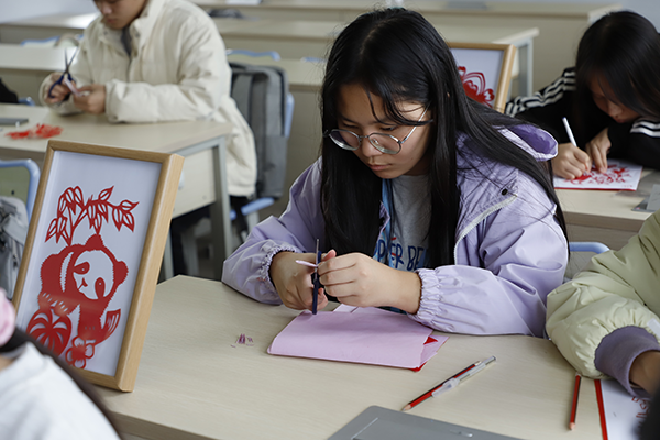 同學們認真創作民族元素剪紙作品