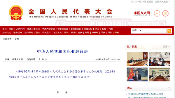 第十四條??國家建立健全適應(yīng)經(jīng)濟社會發(fā)展需要,產(chǎn)教深度融合,職業(yè)學(xué)校教育和職業(yè)培訓(xùn)并重,職業(yè)教育與普通教育相互融通,不同層次職業(yè)教育有效貫通,服務(wù)全民終身學(xué)習(xí)的現(xiàn)代職業(yè)教育體系。
