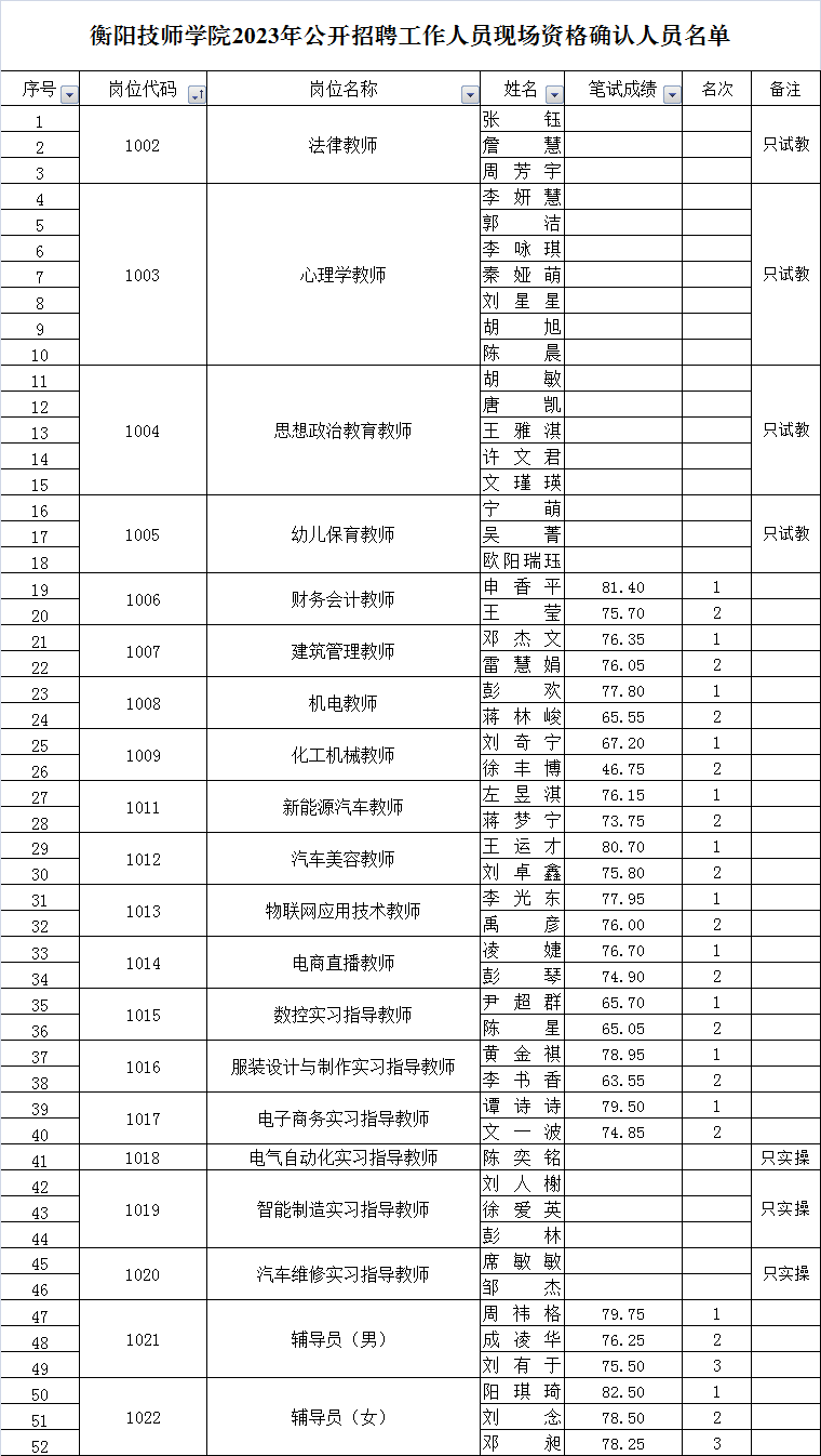 根據(jù)《2023年衡陽技師學(xué)院公開招聘工作人員公告》和招聘工作進(jìn)度,現(xiàn)將現(xiàn)場資格確認(rèn)及面試有關(guān)事項(xiàng)公告如下: