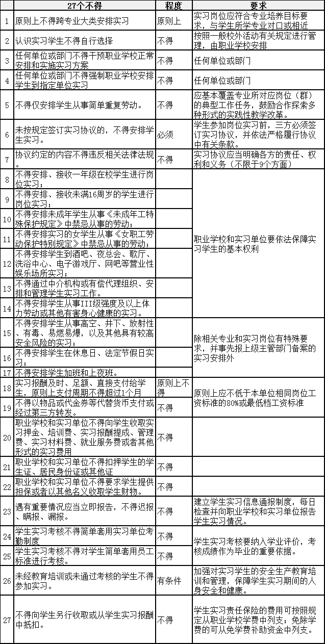 職業(yè)學(xué)校學(xué)生實(shí)習(xí)管理規(guī)定的“27個不得”一覽表