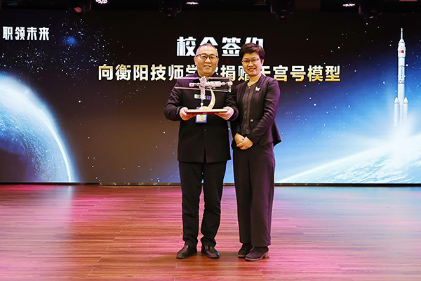 活動伊始,全體人員觀看了航天主題宣傳視頻,回顧我國航天事業的輝煌成就?,F場,學院與上海銀領智造科技有限公司簽署校企合作協議,周少良與企業代表王紅峰共同簽約,王瀾代表學院接受企業捐贈的“天宮號”模型。